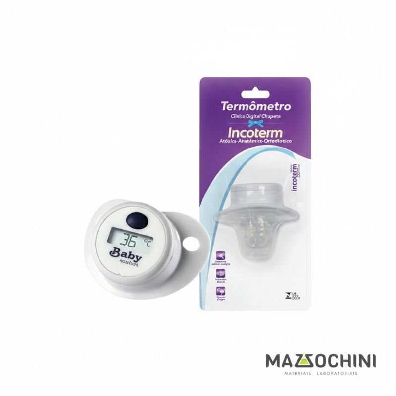 - Atóxico e anatômico; - Bico ortodôntico de silicone; - Sensor à prova d'água; - Alarme de febre; - Memoriza última temperatura. - Instrumento digital com visor de cristal líquido; - Função auto-desligamento após 10 minutos; - Comercializado em blister; - Personalizável com marca própria (blister). INFORMAÇÕES TÉCNICAS Escala: 32ºC...+42ºC Resolução: 0,1ºC Erro máx. Indicado: ±0,2ºC Alimentação: 1 pilha tipo botão de 1,5V (Lr41) Duração da pilha: 250h ou até 1.000 usos Temp. Arm e Transp.: -20ºC... +50ºC
