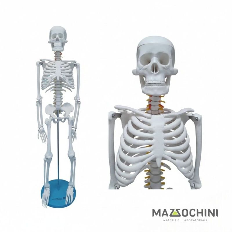 Modelo de esqueleto padrão, articulado com aproximadamente 85cm de altura. Confeccionado em resina plástica rígida na cor natural. Composto por: Ossos do crânio (calota craniana, arcada dentária, cavidade nasal, condutos auditivo, cavidade orbitaria, osso frontal, temporal, vômer, nasal, palatino, etmoide, maxila, mandíbula, parietal, zigomático, lacrimal, esfenoide, occipital) Ossos da coluna vertebral Ossos do tórax (Osso esterno, e costelas) Ossos do membro superior (clavícula, escápula, úmero, ulna, rádio, ossos do carpo, metacarpo e falanges) Ossos da pelve (sacro, ílio, ísquio, sínfise pública, cóccix e púbis e articulação sacroilíaca) Ossos do membro inferior (fêmur, patela, tíbia, fíbula, ossos do tarso, Calcâneo, Metatarso) O modelo TGD-0112 permite: Movimentação da mandíbula Possibilita a remoção dos membros superiores, membros inferiores e a calota craniana Visualização das suturas do crânio Visualização dos forames do crânio Acompanha: Base Suporte em metal Manual do usuário
