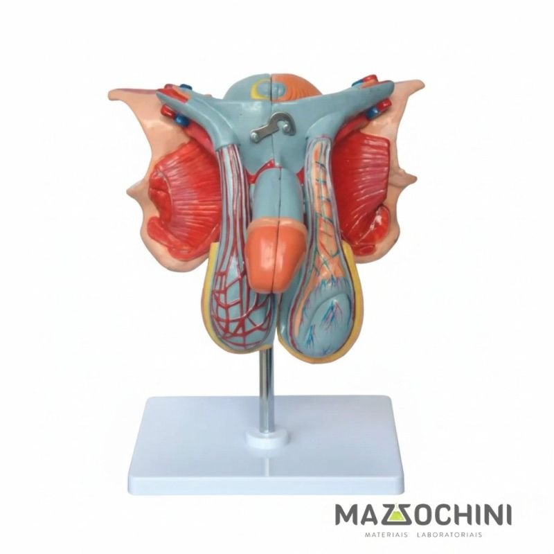 Modelo anatômico do órgão genital masculino, desmontável em até 5 partes, evidencia estruturas anatômicas com riqueza de detalhes. Confeccionado em PVC especial, montado sobre base. Composto por: Órgão genital masculino: apresentando: testículos, epidídimo, ducto deferente, vesícula seminal, próstata, veias e artérias, corpo cavernoso, corpo esponjoso, bexiga urinária, uretra masculina, escroto, pênis, prepúcio, períneo e óstio externo da uretra. O modelo TZJ-0353-E permite: Desmontar o modelo em 5 partes Visualizar identificar as partes internas e externas do órgão genital masculino. Acompanha: Card. com QRCODE. Embalagem: caixa de papelão